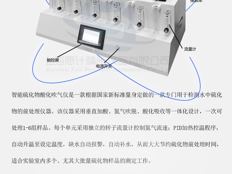 智能硫化物酸化吹氣儀是一款根據(jù)國家新標(biāo)準(zhǔn)量身定做的一款專門用于檢測(cè)水中硫化物的前處理儀器。該儀器采用垂直加酸、氮?dú)獯得摗⑺峄盏纫惑w化設(shè)計(jì),一次可處理1-6組樣品。每個(gè)單元采用獨(dú)立的轉(zhuǎn)子流量計(jì)控制氮?dú)饬魉伲籔ID加熱控溫程序,自動(dòng)升溫至設(shè)定溫度,缺水自動(dòng)報(bào)警,自動(dòng)補(bǔ)水,從而大大節(jié)約硫化物前處理時(shí)間,適合實(shí)驗(yàn)室內(nèi)多個(gè)、尤其大批量硫化物樣品的測(cè)定工作。