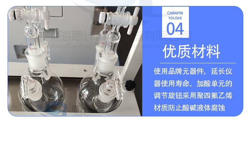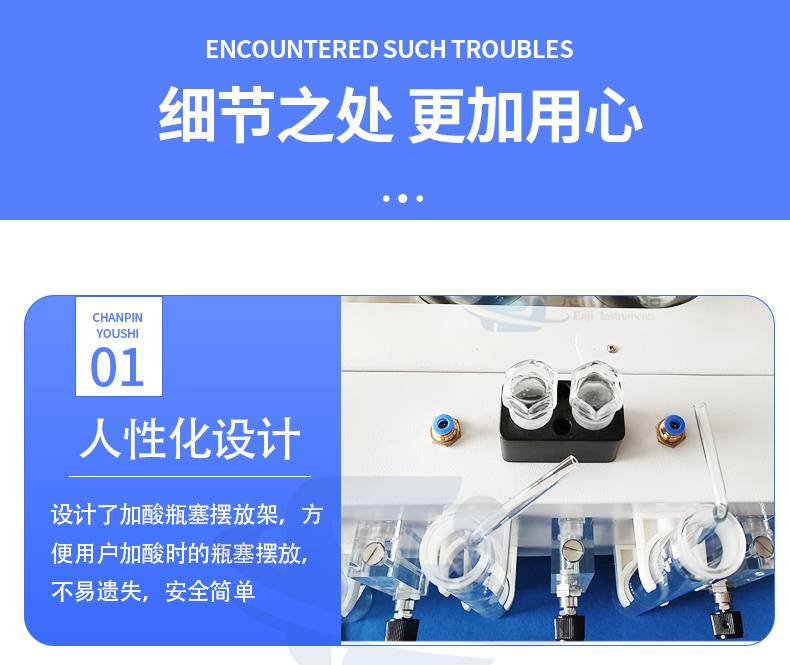 9、垂直加酸,加酸單元與反應(yīng)瓶采用磨口垂直連接;加酸單元的調(diào)節(jié)旋鈕采用聚四氟乙烯材質(zhì)防止酸堿液體腐蝕。
